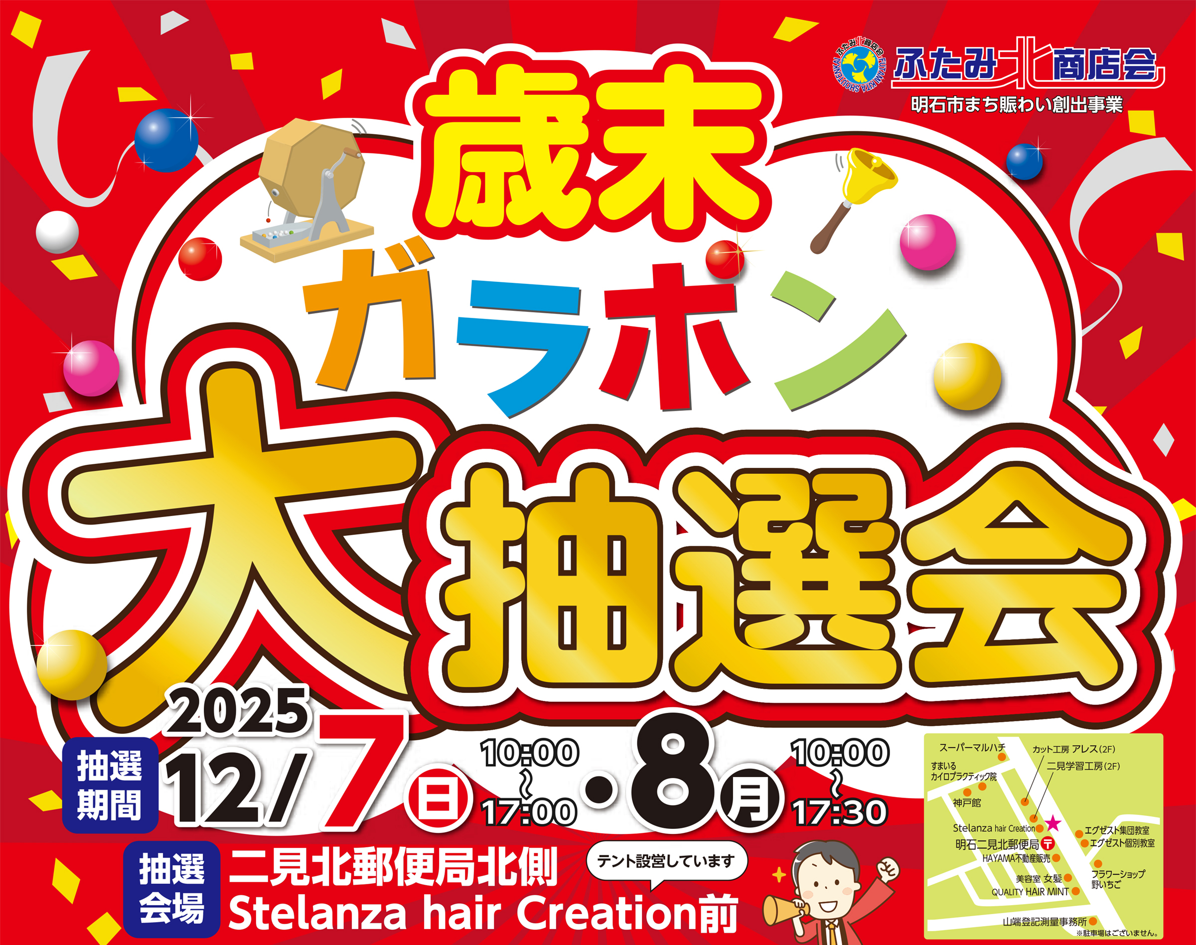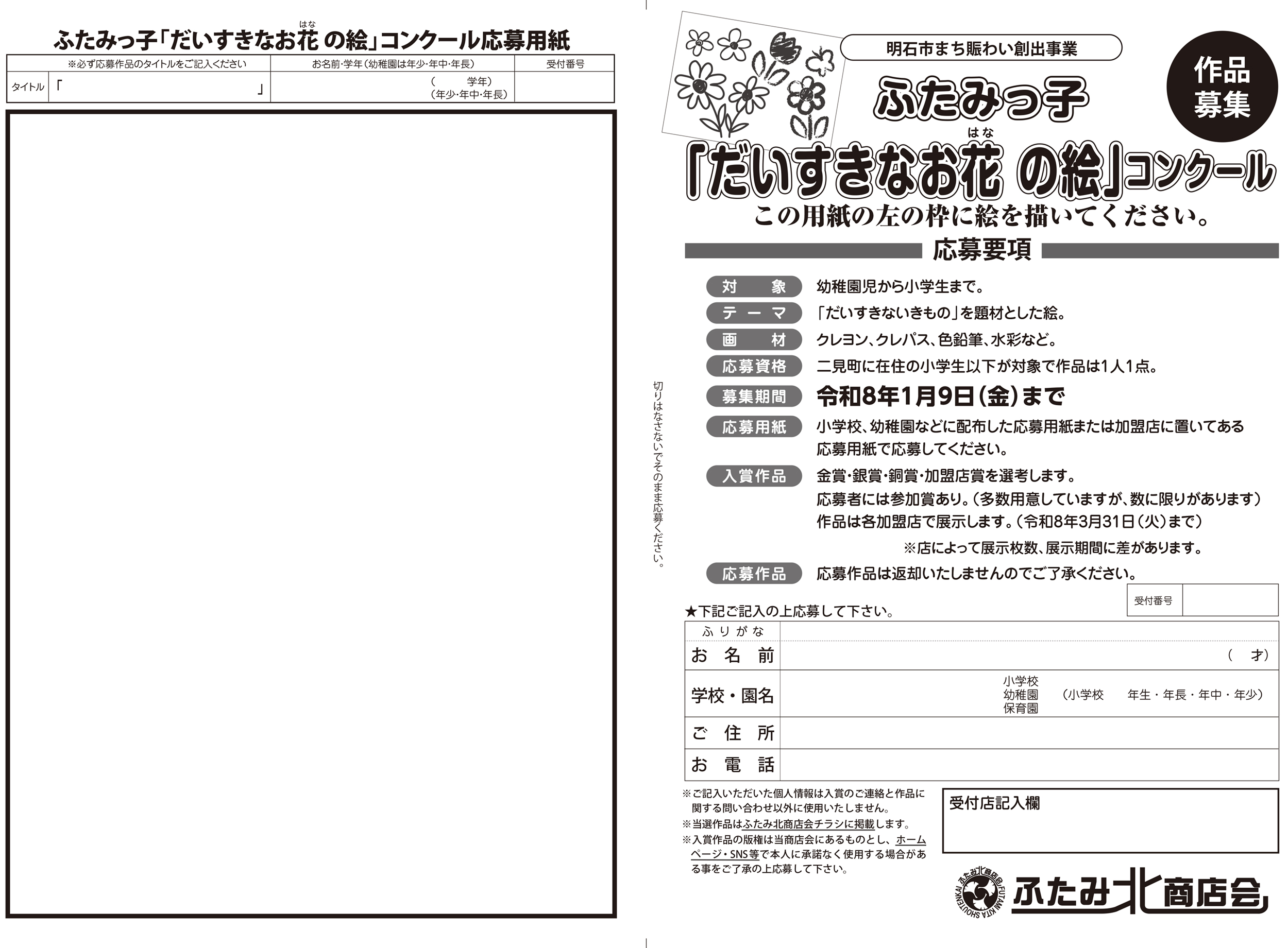 2025年11月28日 blog ふたみっ子「だいすきなお花 の絵」コンクールのお知らせ 対象 幼稚園児から小学生まで。 テーマ 「だいすきなお花」を題材とした絵。 画材 クレヨン、クレパス、色鉛筆、水彩など。 応募資格 二見町に在住の小学生以下が対象で、作品は1人1点。 募集期間 令和8年1月9日(金)まで […] 2025年11月28日 blog ガラポン抽選会2025のお知らせ 今年もこの季節がやってきました! ワクワクのガラポン抽選会、開催します! 今年も豪華な景品をたくさんご用意しました。 何が当たるかはガラポンを回してからのお楽しみ! 商店会でお買い物をして、抽選補助券を集めてご参加くださ […]